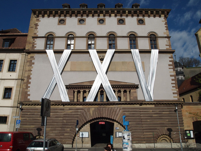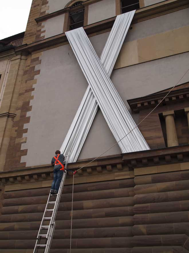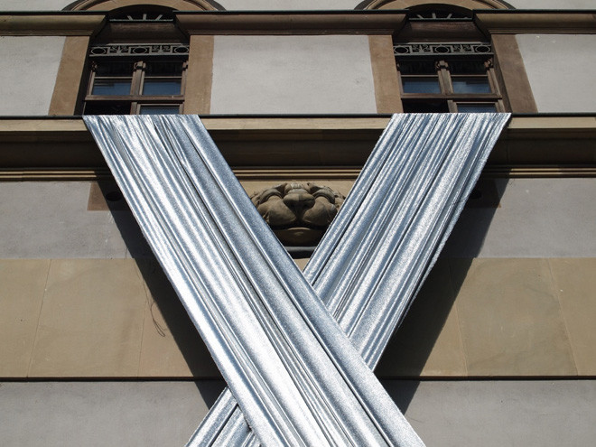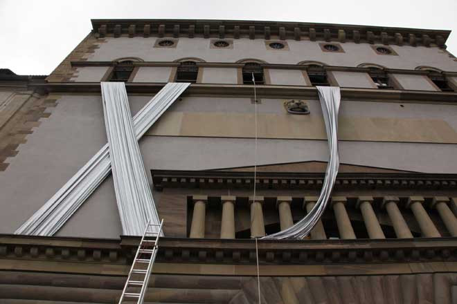 Der silberne, metallisch glänzende Stoff, der sich in feierlich dekorativen Bahnen über die Fassade spannt, kontrastiert die ursprüngliche Intension der nüchtern reduzierten Architektur und greift das Prinzip der Symbolik auf. Kodiert repräsentieren die grafischen Zeichen XXV das 25-jährige Jubiläum. Auch die silberne Optik des Materials steht gemeinhin symbolisch für die Zahl 25 und sorgt weit sichtbar für aufmerksamkeitsstarke Lichteffekte.