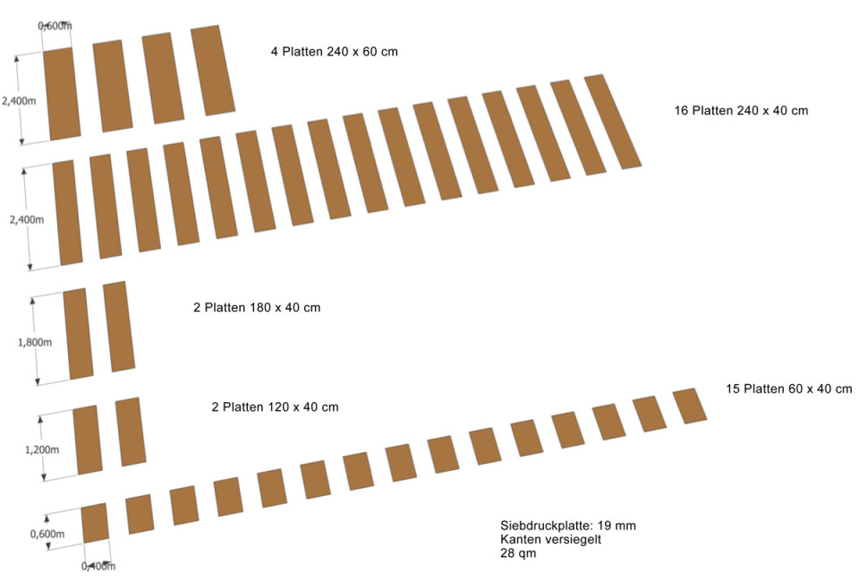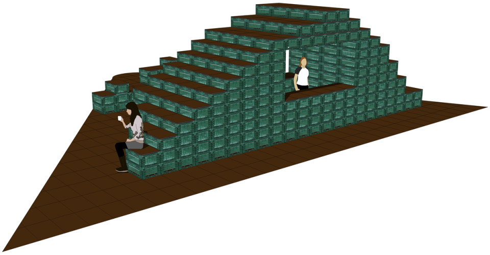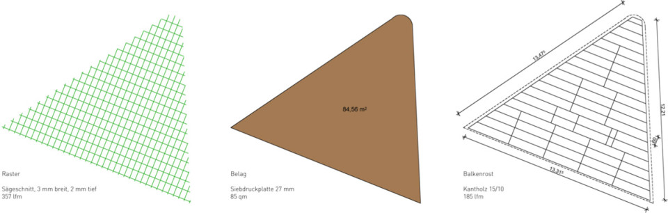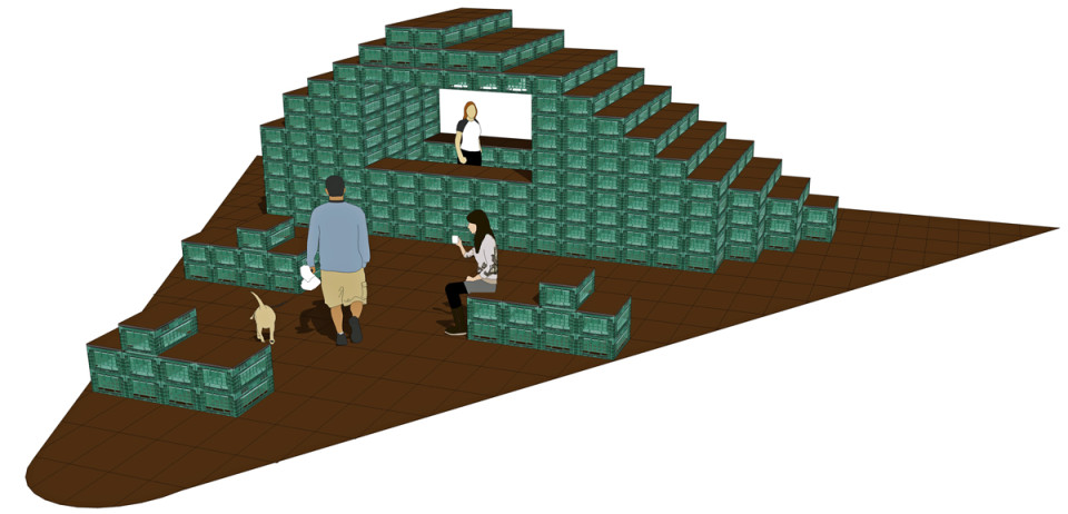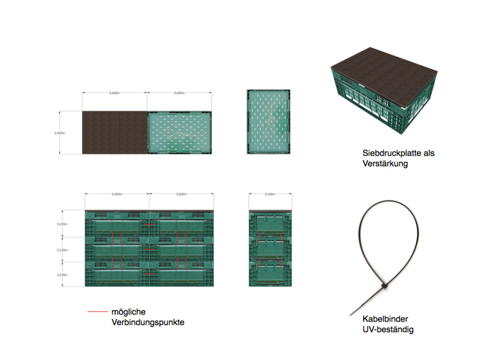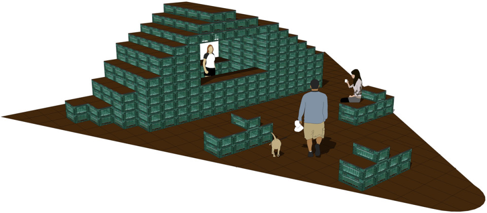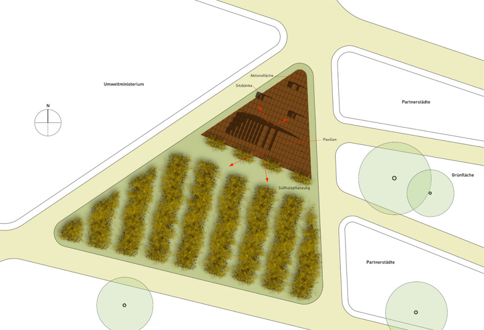 Das Grundraster für die Gestaltung der Fläche entspricht den Abmessungen einer Gemüsekiste 60 x 40 cm. Das Raster nimmt die Fluchtlinien der Wegeführung auf dem LGS-Gelände auf. Der Pavillon ist am südlichen Rand der Aktionsfläche platziert, damit die befestigt Fläche möglichst gut für Veranstaltungen genutzt werden kann. Der Verkauf kann beidseitig nach Norden und Süden hin erfolgen. Durch flexible Elemente in Sitz-, Tisch- und Thekenhöhe sind Pavillon und Aktionsfläche vielseitig bespielbar. Im geschlossenen Zustand können alle Elemente im Inneren des Pavillons sicher verstaut werden.