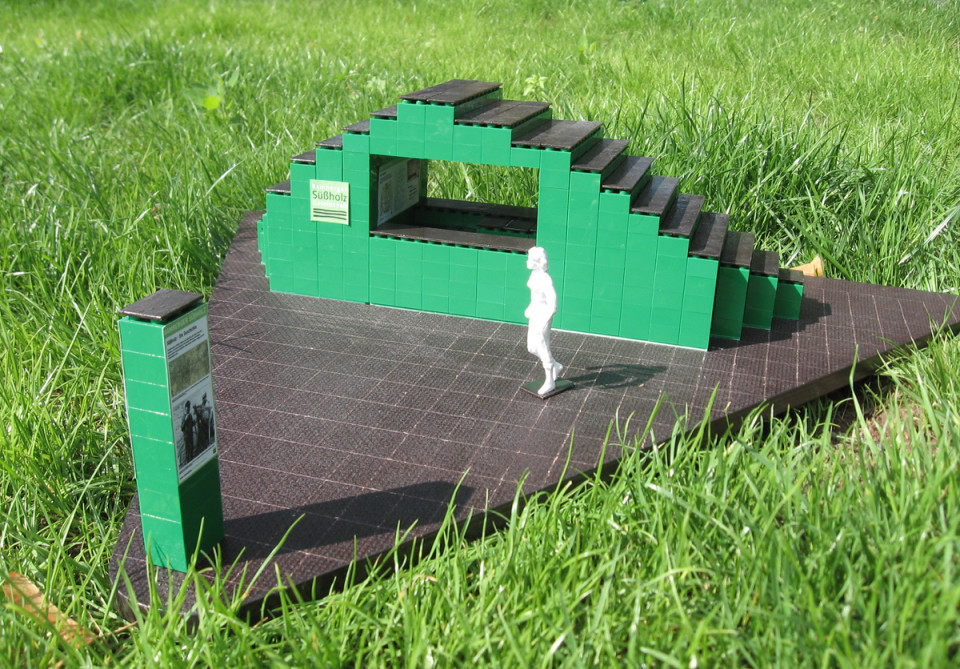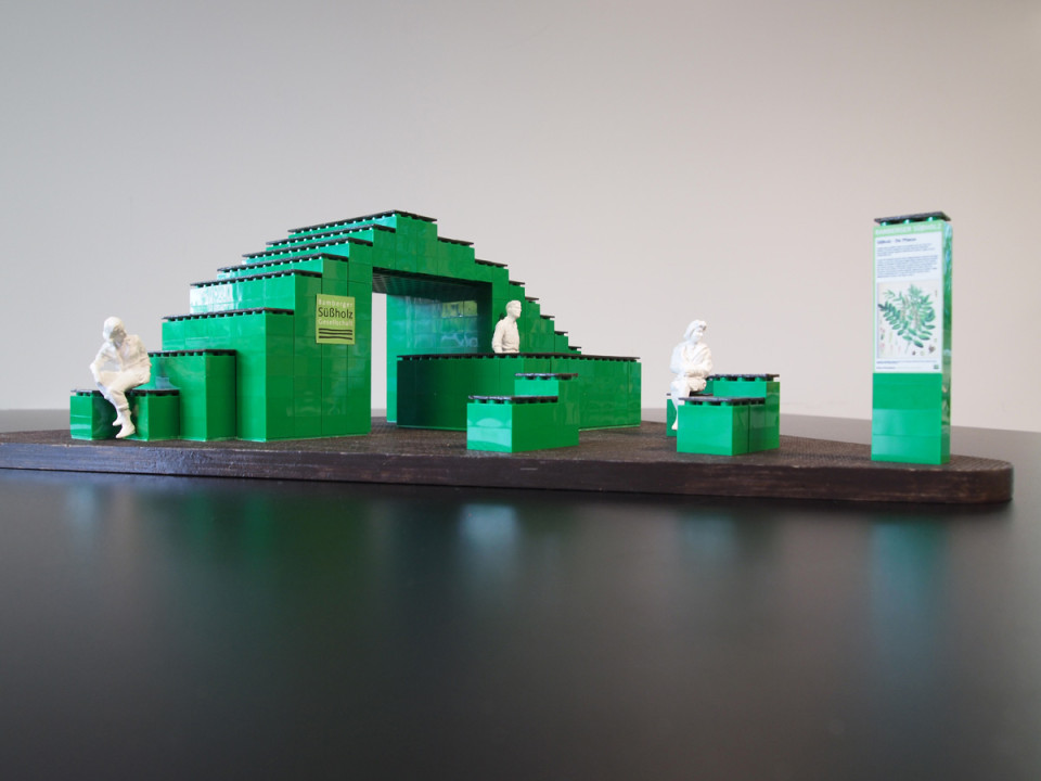 Der Pavillon ist im "Baukastensystem" errichtet. Der Grundbaustein ist die grüne Obst- und Gemüsebox vom Typ "246", die Grundausstattung eines jeden Gärtnereibetriebs ist. Oft ist bei Märkten zu beobachten, dass mit diesen Boxen eine "Verkaufsarchitektur" erzeugt wird. Dieses Prinzip wird für die Konstruktion des Süßholzpavillons aufgegriffen. Die modulare Bauweise erlaubt maximale Flexibilität. Aufgrund der grünen Färbung stellen die Plattformen einen Bezug zur Landschaft und zum Thema Gartenbau her. Alle sichtbaren Oberseiten der Boxen werden mit aufgeschraubten wetterbeständigen Siebdruckplatten stabilisiert. Die Boxen werden gestapelt und untereinander mit Kabelbindern bzw. Schrauben fixiert. Da die Boxen nicht beschädigt werden, können sie nach Ablauf der Landesgartenschau wieder in den Pfandkreislauf der Gemüsekisten zurückgeführt werden. Hierdurch wird der Aspekt der Nachhaltigkeit stark betont.