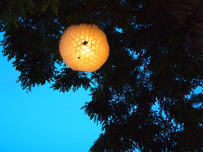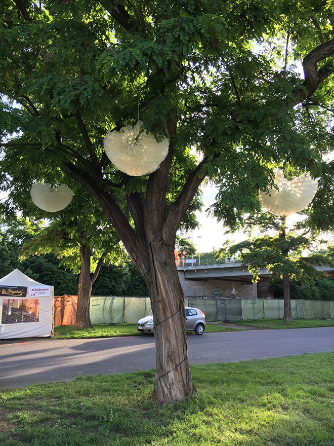 Aus ca. 500 ausrangierten Pfandbechern entstand eine Lichtinstallation in Form von 3 Halbkugeln. Die Becher wurden mit Heißkleber und Nieten in kleinen Einheiten verbunden und dann mit Maurerschnur zu Kugeln gehängt. Im Zentrum befindet sich jeweils eine Kugellampe. Die Radien der Halbkugeln leiten sich aus der konischen Grundform der Becher ab. Durch die Hängung entsteht eine stabile aber flexible Konstruktion, die alle Becher zu einem lockeren Bündel zusammenfasst. Durch die Verbindung und Wiederholung der kleinteiligen Formen entstehen wabenartige Strukturen und ein organischer Gesamteindruck. Die etwa 1 m großen Objekte wurden hängend im Baum installiert. Sie wirken wie große Blüten oder Früchte. So entsteht ein interessantes Zusammenspiel von Plastikmüll und Natur.